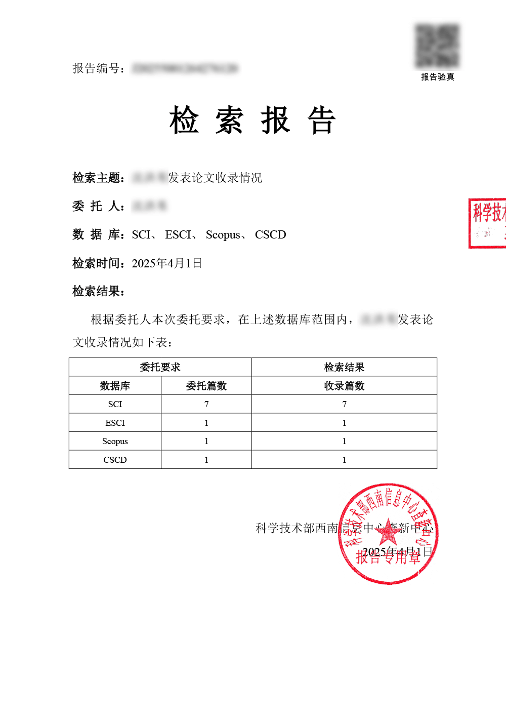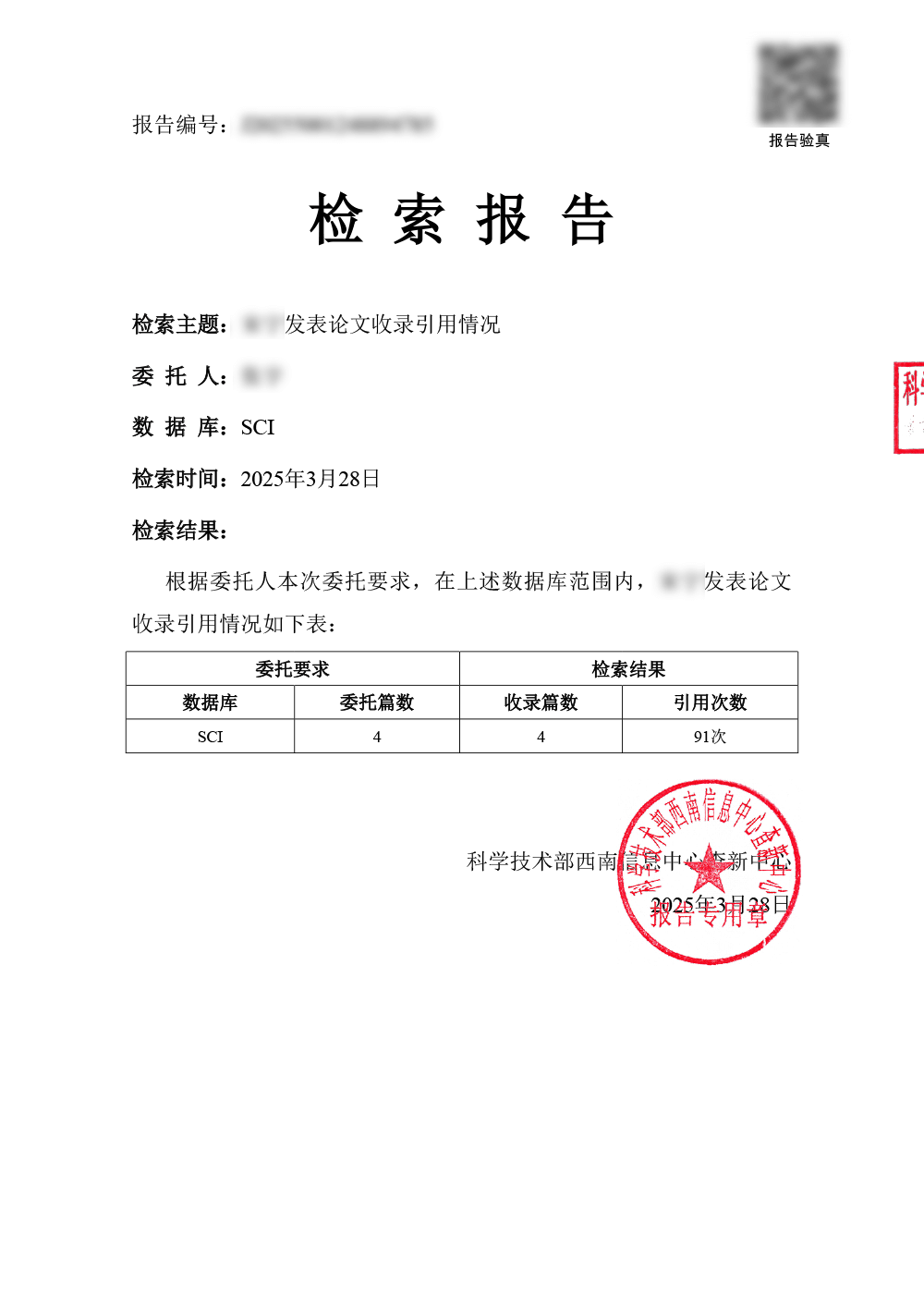 检索报告(又称查收查引)指通过检索国内外主流数据库,查询个人、团队等的代表性论著收录和引用情况,为职称评定、项目申报、人才评价等需求提供客观、准确的第三方检索报告。